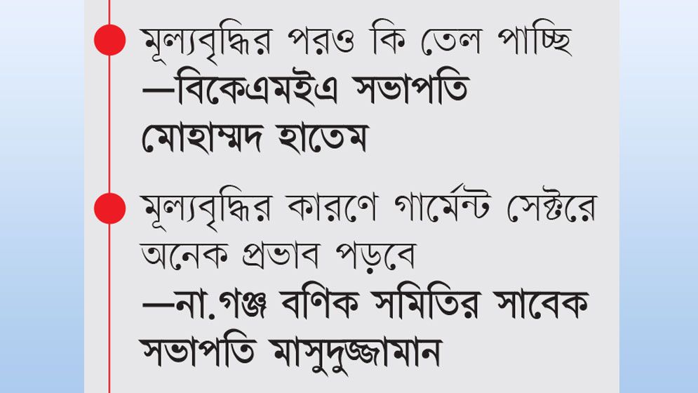 নারায়ণগঞ্জের ব্যবসায়ী নারায়ণগঞ্জ এলাকার এক শিল্প উদ্যোক্তা জানান, জ্বালানি তেলের দাম বৃদ্ধির কারণে কনটেইনার ভাড়া থেকে শুরু করে উৎপাদনের সব খরচ বেড়ে গেছে। অথচ ক্রেতারা আগের দামে পণ্য নিতে চাইছেন, ফলে উদ্যোক্তাদের নিজেদের পকেট থেকে ভর্তুকি দিয়ে ব্যবসা চালাতে হচ্ছে।